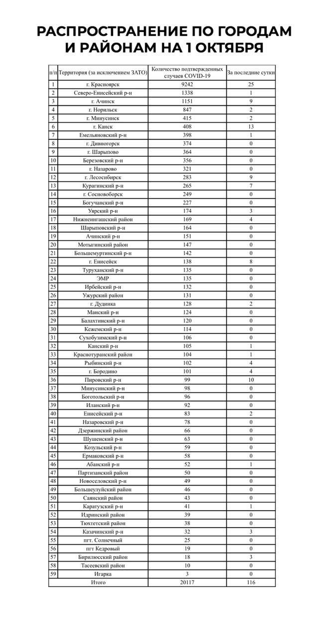 Краевой Роспотребнадзор отмечает, что темп прироста за сутки составил 0,6%. Случаи инфицирования фиксировались во всех муниципальных образованиях региона. Красноярский край находится на третьем этапе снятия «ковидных» ограничений.