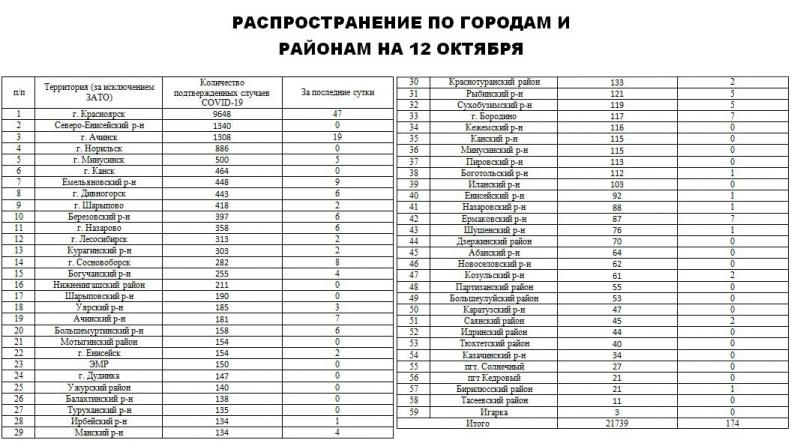 По данным на 12 октября, COVID-19 выявили у 21 739 жителей Красноярского края, суточный прирост — 174 человека.