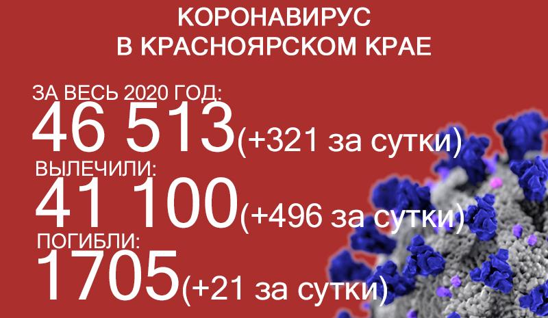 За последние сутки коронавирус выявили ещё у 321 человека, 496 — выписали из больниц, скончался 21 больной. Всего за год COVID-19 заболело 46 513 жителей края, 41 100 из них уже выздоровели, 1705 заразившихся скончались.