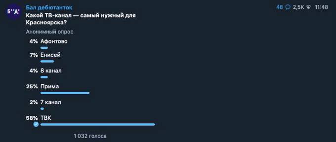 После юбилея «Примы-ТВ» телеграм-каналы задались вопросом о том, какой канал из ныне имеющихся самый нужный для жителей Красноярска, и решили провести опросы среди своих подписчиков.