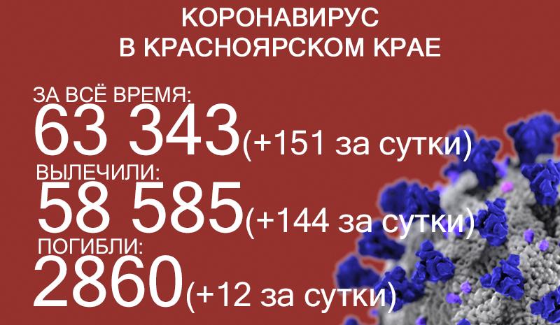 5 марта число заразившихся коронавирусом в Красноярском крае возросло до 63 343, за последние сутки выявили ещё 151 больного. Темп прироста — 0,2%.