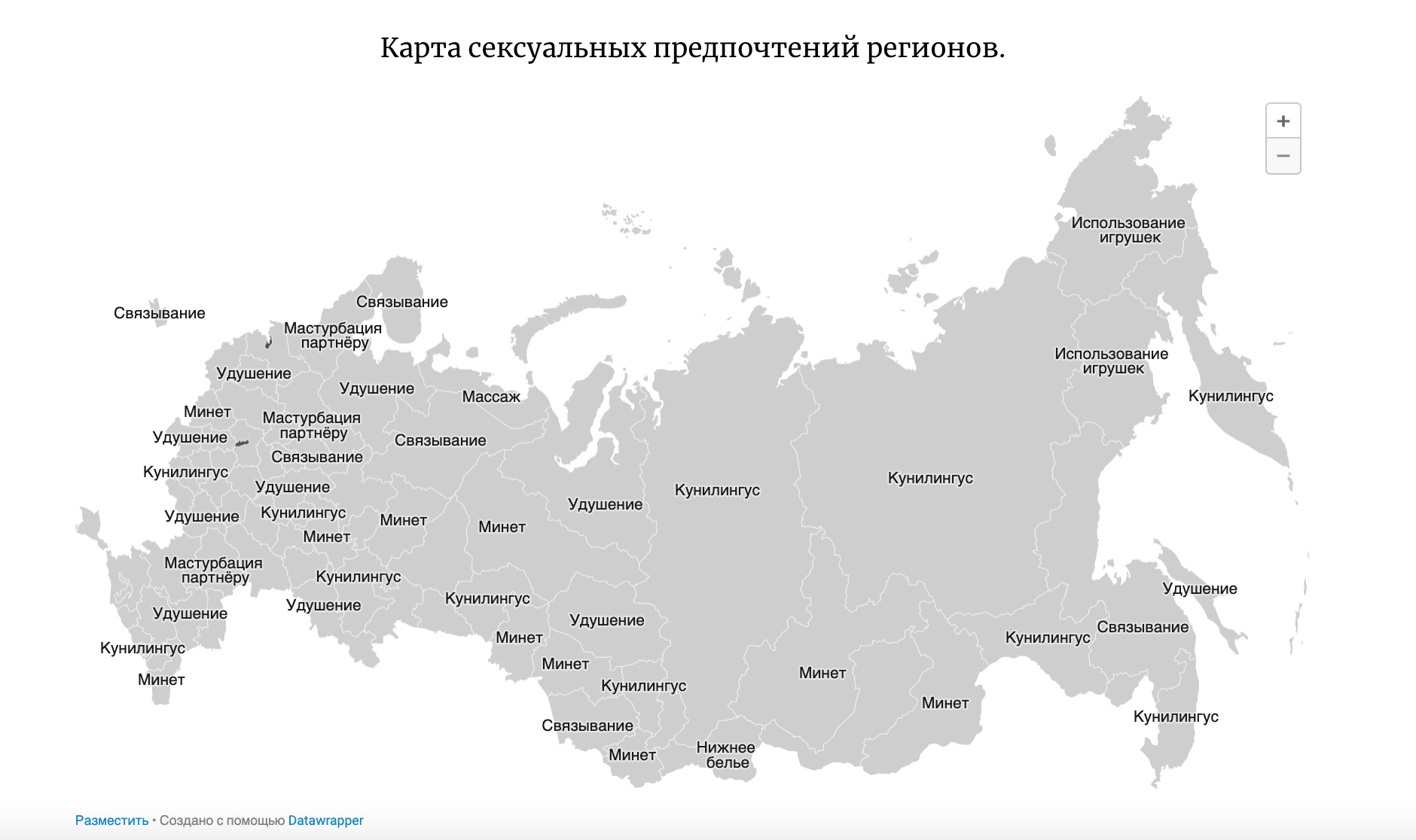 По данным на 22 октября, опрос прошли уже около 19 тысяч человек. Гончаров наложил данные о сексуальных предпочтениях россиян на карту страны. Оказалось, что чаще всего жители Красноярского края предпочитают кунилингус, соседи из Иркутской области предпочитают минет, в Томской области популярно удушение. В Москве и Санкт-Петербурге самой популярной сексуальной практикой также является минет.