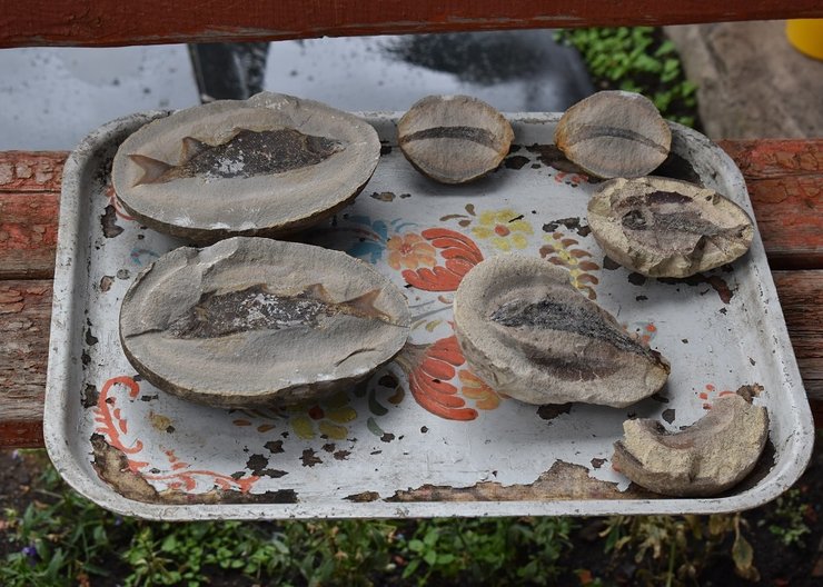 Житель посёлка Преображенский Геннадий нашёл несколько круглых камней рядом со своих домом. Он решил расколоть их и обнаружил внутри останки рыб. Заядлый рыбак не смог определить, что это за вид.