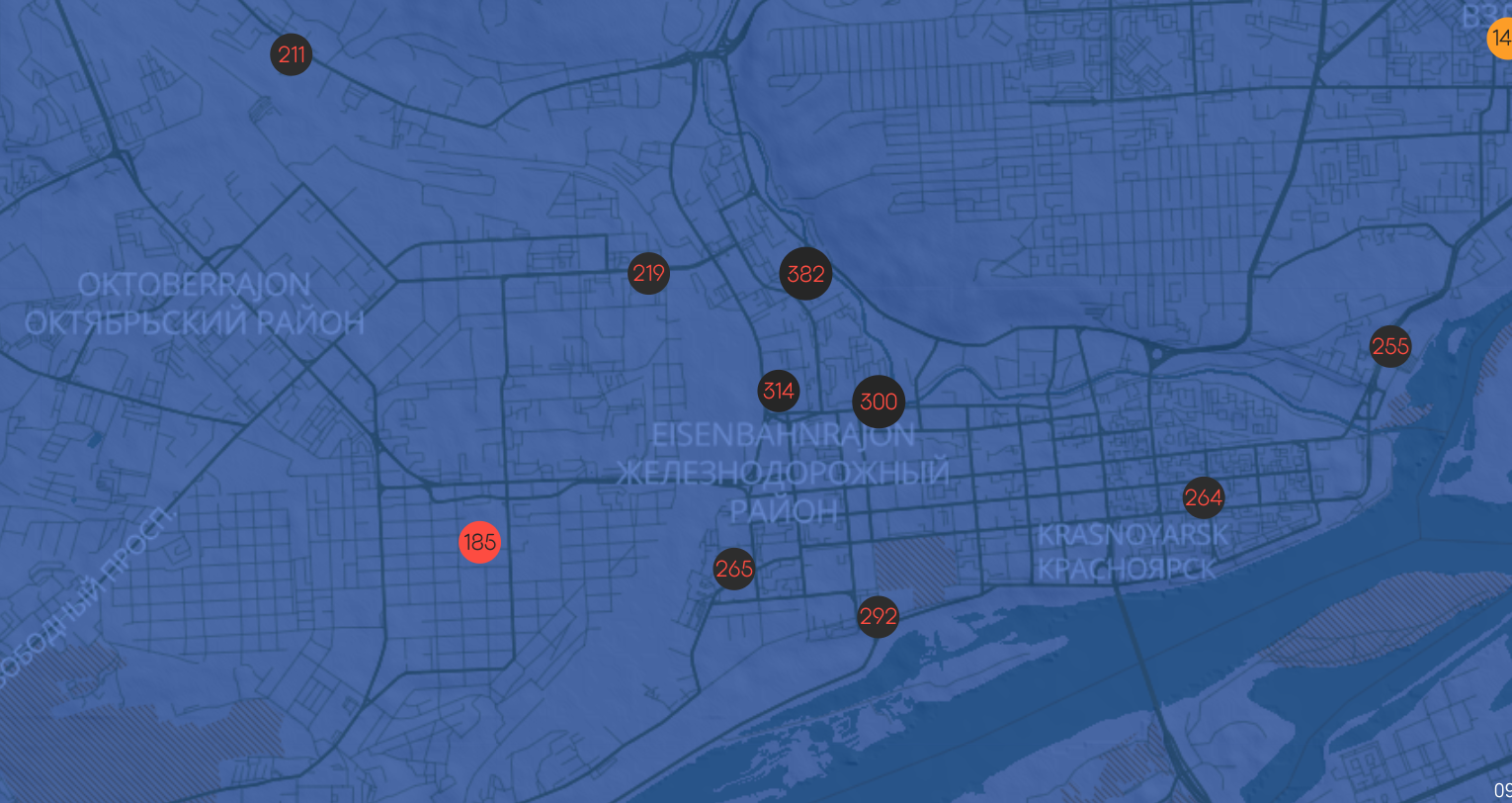 Датчики Nebo.livе фиксируют сильное загрязнение в центре Красноярска, в районе улиц Ладо Кецховели и Калинина, а также на Железнодорожников.