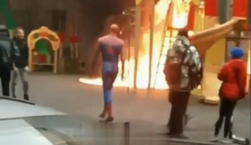 На кадрах очевидцев видно, что «супер-герой» позирует на фоне горящей площадки. Сам Человек-паук заявил, что он не имеет отношения к происшествию и не знает, кто это сделал. Парень рассказал, что пришел на площадку, чтобы раздать детям шоколадки.