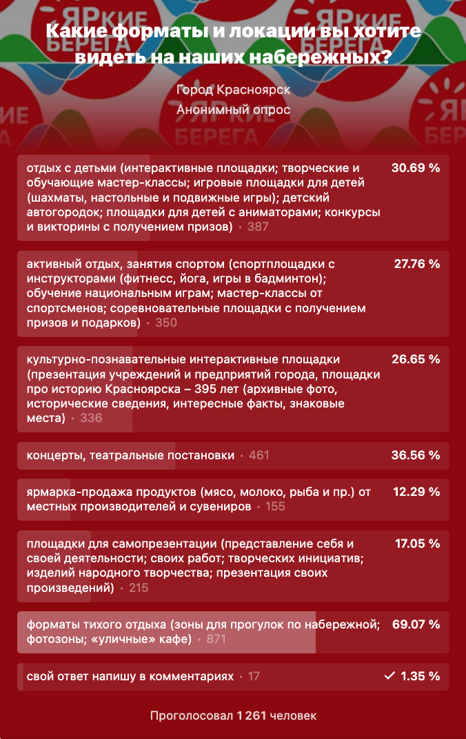 В Красноярске планируют запустить новый проект «ЯРкие берега», который станет альтернативой «В центре Мира». На набережных города хотят обустроить площадки для разных видов отдыха – от активного до тихого. В группе администрации города во «ВКонтакте» провели опрос, чтобы узнать мнение красноярцев.