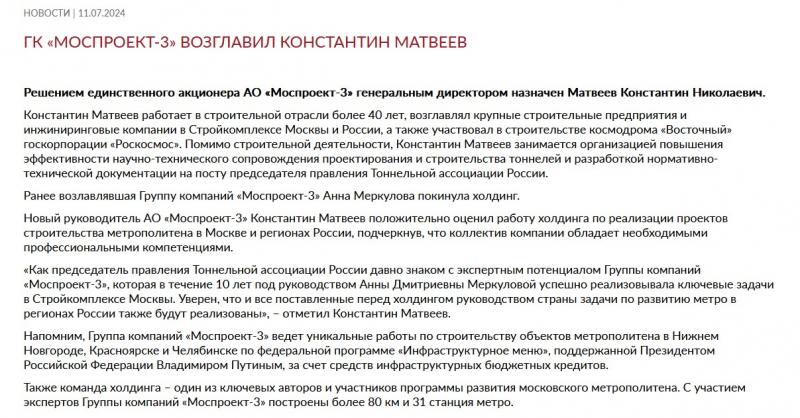 Судя по информации с официального сайта компании, Константин Матвеев положительно оценил работу холдинга по реализации проектов строительства метрополитена в Москве и в регионах страны, отметив, что коллектив компании обладает необходимыми профессиональными компетенциями.