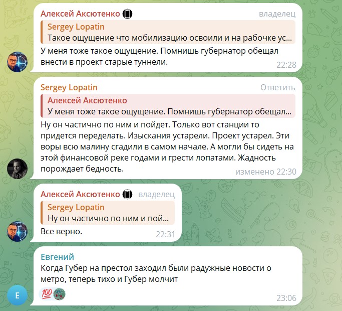 «Стоит признать, основные работы по строительству красноярского метрополитена так и не ведутся. Всё, что происходит на объектах, это, скорее, имитация деятельности. Бутафорские заборы, строительные городки и частичное освоение средств краевого и городского бюджетов на так называемые подготовительные работы. Ну и, конечно, власти и подрядчики рассказывают о щепетильной и длительной работе с проектной документацией», – делится мнением телеграм-канал «Аксютенко Life».