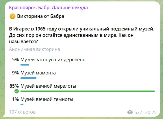 В минувшие выходные Бабр решил выяснить, знают ли подписчики красноярского телеграм-канала «Красноярск. Бабр. Дальше некуда» (@kras_24) про уникальный подземный музей, который расположен в Игарке. Оказалось, что большинство подписчиков знает про это необычное место.