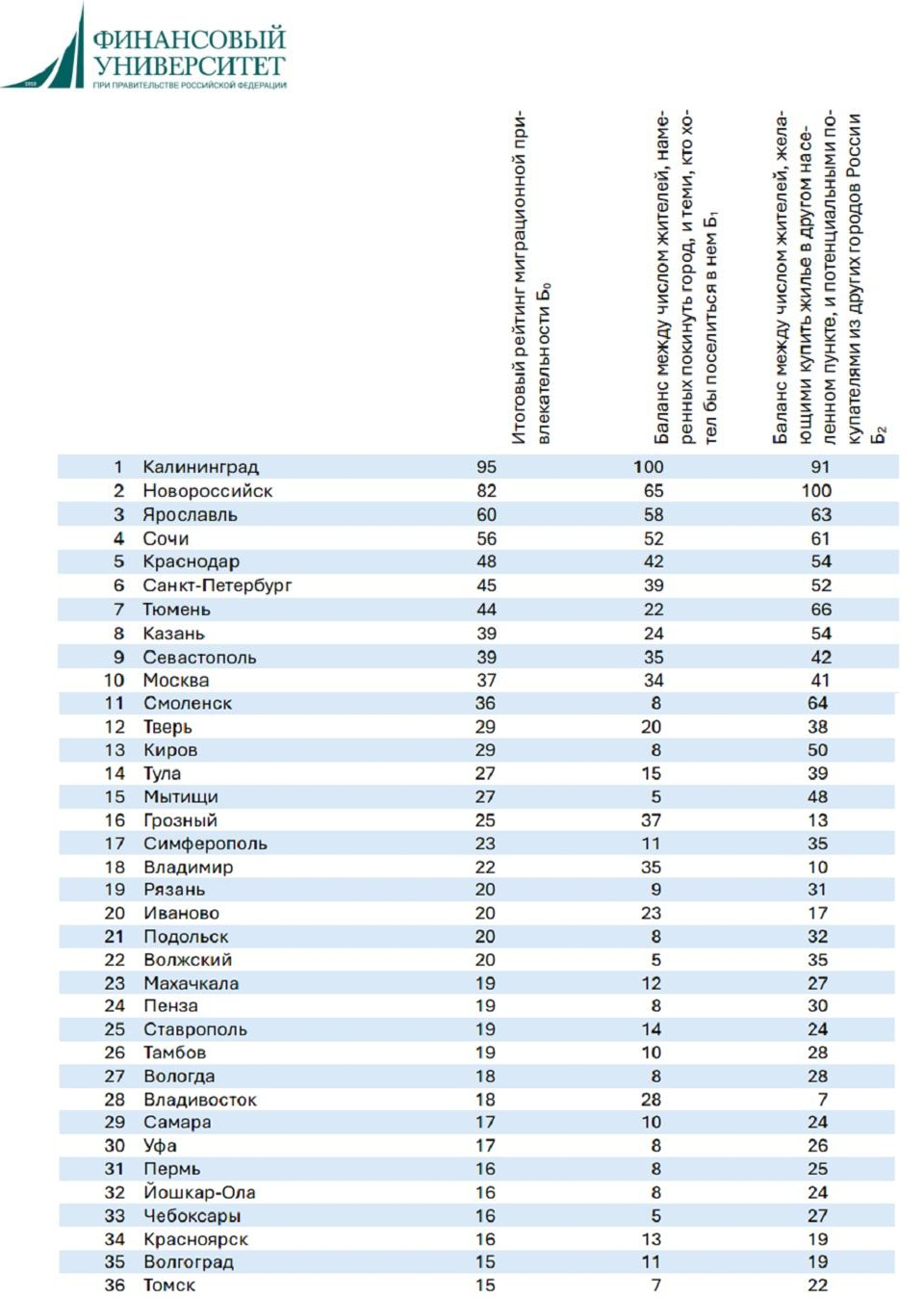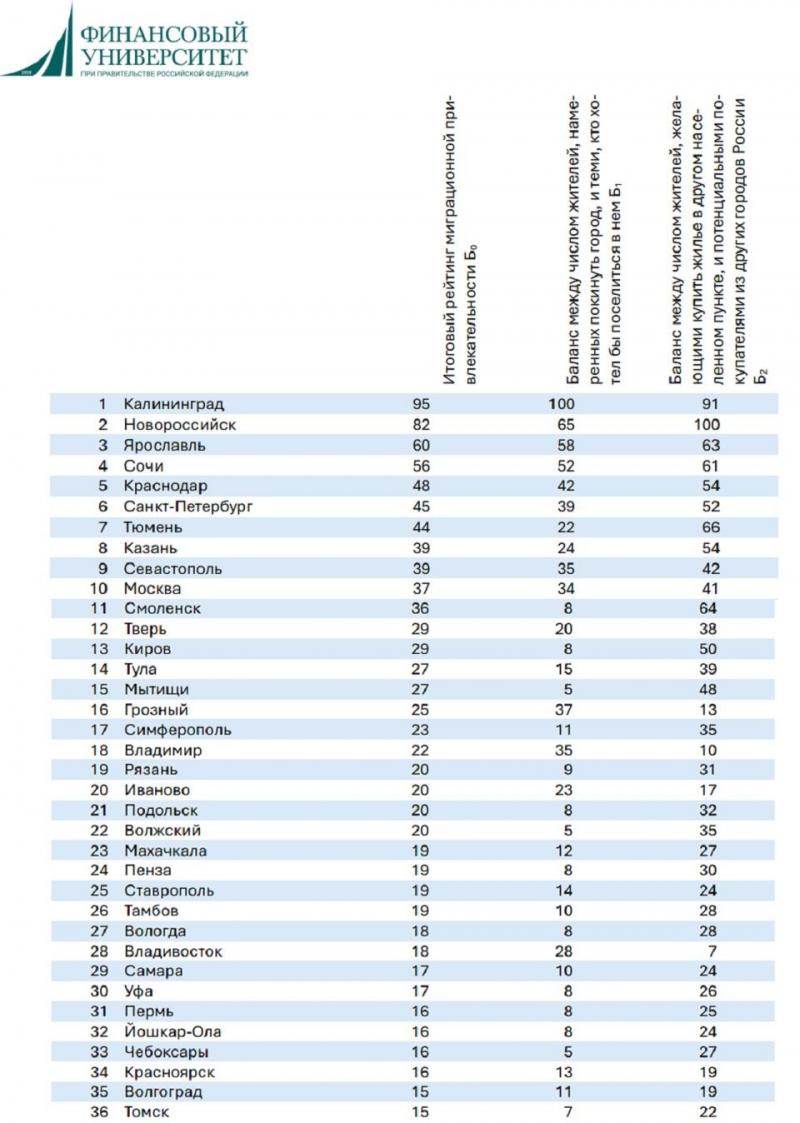 Самыми привлекательными для переезда городами стали Калининград (индекс 95), Новороссийск (82), Ярославль (60), Сочи (56) и Краснодар (48). В десятку также вошли Санкт-Петербург (45), Тюмень, Казань, Севастополь и Москва, набравшая 37 баллов. Исследователи объяснили сравнительно низкую позицию Москвы тем, что многие мигранты, заработавшие в столице на жилье, возвращаются в свои родные города.