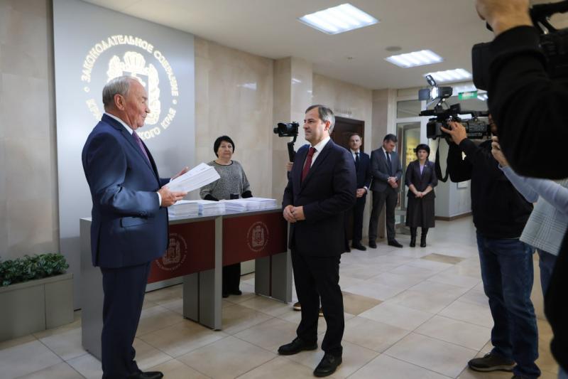 Главный финансовый документ края насчитывает 3363 страницы. Министр финансов Владимир Бахарь передал проект председателю комитета по бюджету, государственной собственности и защите прав граждан Владимиру Чащину.
