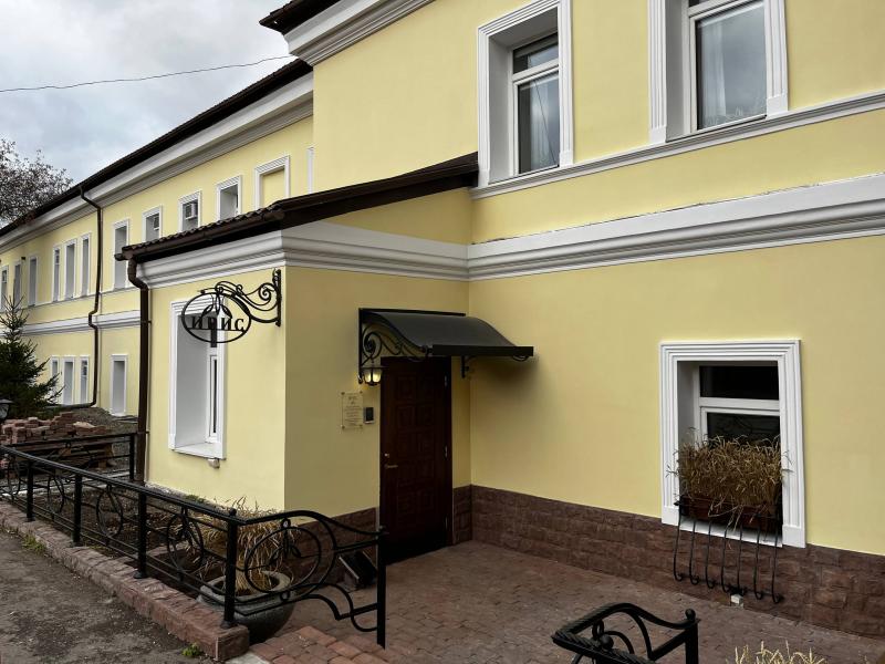 Отель расположен в самом центре, но прячется во дворе старинного особняка. Здание, где сегодня принимает гостей «Ирис», — бывшее Епархиальное женское училище конца XIX века. Когда-то здесь учили будущих жён священников: воспитанницы изучали Закон Божий, педагогику и домашние науки. После революции училище закрыли, и особняк пережил долгий упадок.