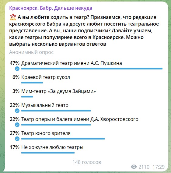 Настало время подвести итоги опроса и викторины, которые касались театральной тематики. Бабр решил поинтересоваться у подписчиков, какие театры они предпочитают посещать, и какой театр первым появился в Красноярске и считается старейшим в Сибири? Удивительным образом правильный ответ викторины совпал с выбором театра нашими подписчиками.