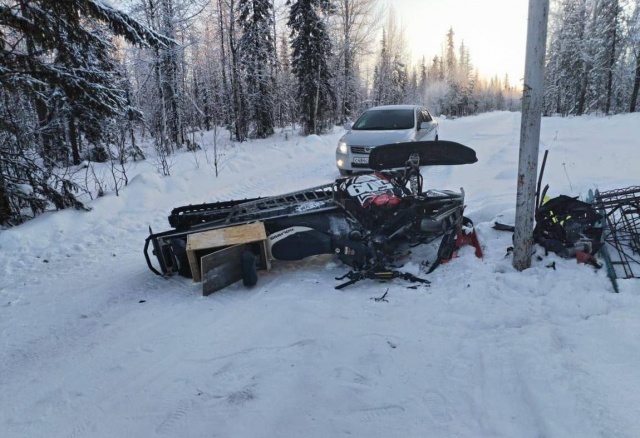 По данным Госавтоинспекции, мужчина катался с сыном по полевой дороге, когда произошла авария. После столкновения снегоход опрокинулся. Сам водитель получил перелом и ушиб.