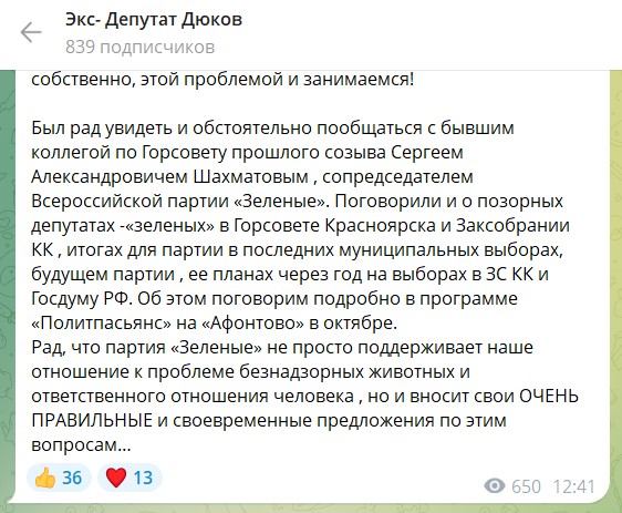 В конспирологию ударился телеграм-канал «Красноярский лев». По его мнению, изгнание супругов-депутатов дело рук Вячеслава Дюкова, который якобы нанёс ответный удар. Причём тут Дюков? В начале октября он ездил в Москву на съезд защитников животных, где с Шахматовым обсудил Иванову и Головкина. В качестве доказательства канал приводит цитату из соцсетей Дюкова, где он упоминает о позорных депутатах-зелёных в горсовете и Заксобрании. Действительно, кто это ещё может быть, если не Иванова и Головкин?