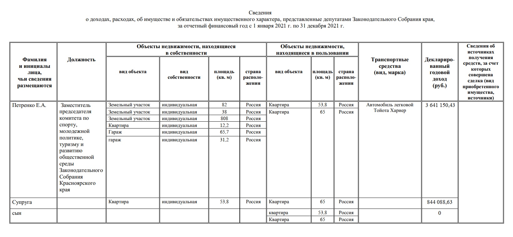 За годы парламентской деятельности Петренко увеличил свой денежный доход без малого в четыре раза (с 900 с лишним тысяч рублей до 3,6 миллиона рублей), а также обзавелся новой квартирой и земельным участком. Однако всю доступную широкой общественности депутатскую жизнь Евгений Петренко был верен своей «Тойоте Харриер».