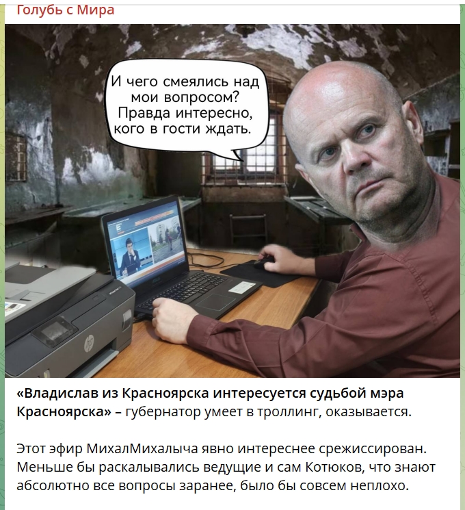 Разумеется, не мог не запомниться вопрос от Владислава из Красноярска про мэра Красноярска. Чувство юмора у создателей прямой линии есть. На этом вопросе губернатор почти засмеялся. Мемы по теме, конечно, будут смешными, а ситуация – страшная.