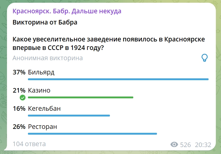 Викторина, которую Бабр проводил в прошлые выходные, оказалась не такой простой. Большинство участников выбрали неправильный вариант ответа про увеселительное заведение Красноярска, которое впервые появилось в 1924 году. Факт неожиданный. А правильный ответ оказался только на третьем месте. Но, чему удивляться, ведь официально казино запретили ещё в 2009 году.