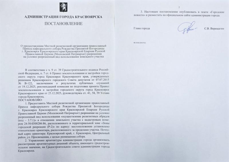 Решение Сергея Верещагина о предоставлении православному приходу кафедрального собора Рождества Пресвятой Богородицы земельного участка 17 тыс кв.м. на берегу Енисея под «осуществление религиозных обрядов» было принято не просто так. Его предваряли публичные слушания, результаты которых утверждены месяц назад, 19 декабря прошлого года, и рекомендации комиссии по плану землепользования и застройки от 25 декабря. Решение это знаковое хотя бы потому, что окончательно утверждает существование самого кафедрального собора Рождества Пресвятой Богородицы на Стрелке в том или ином виде.