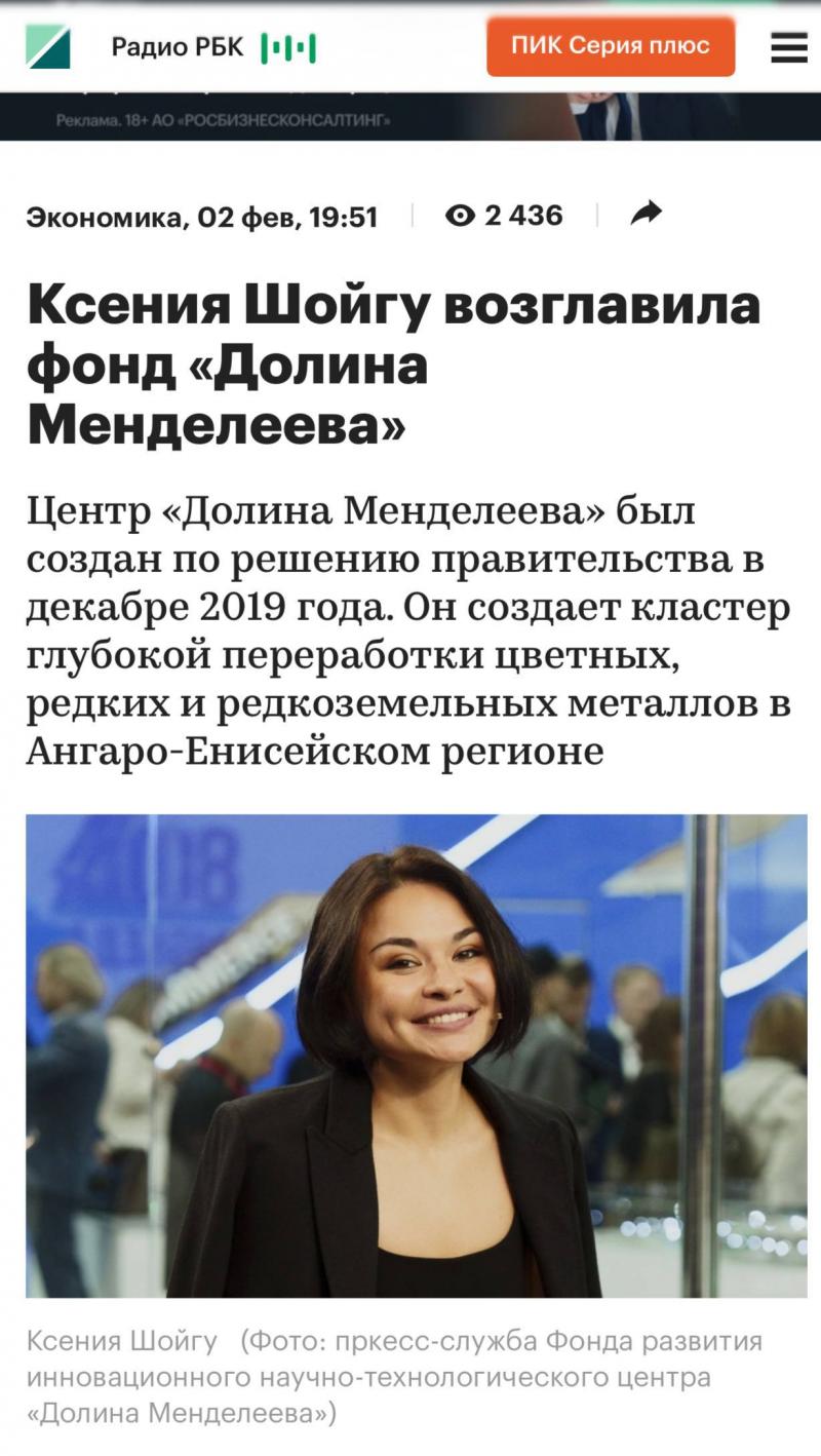 На прошлой неделе стало известно, что дочь Шойгу возглавит кластер по добыче и переработке редкоземельных металлов в Красноярском крае. Общественность восприняла это как хороший знак.
