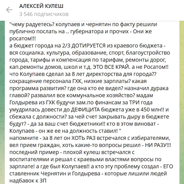 По всей видимости, в ответ на такой пассаж Алексей Кулеш достал из рукава джокер и опубликовал в своём телеграм-канале комментарий размером с простыню. По словам Кулеша, этот комментарий он нашёл под публикацией канала, который администрирует предвыборный штаб «Росатома». Сейчас этого комментария уже нет – его удалили.