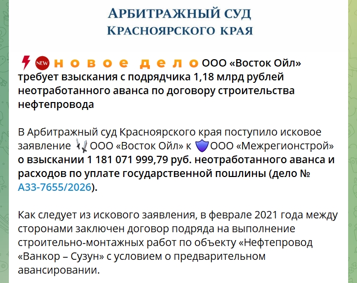 В 2021 году ООО «Восток Ойл» подписала договор с очень крупной московской компанией «Межрегионстрой» на строительство нефтепровода «Ванкор – Сузун». На сегодня работы выполнены меньше чем на 40%, просрочка по отдельным этапам составляет 600 дней. С декабря-2025 подрядчик отсутствует на объекте.