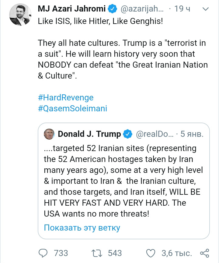 «Как ИГИЛ, Гитлер, Чингисхан! Они все ненавидели культуру. Трамп – это террорист в костюме. Очень скоро он поймет, что никто не может победить великие иранские нацию и культуру.»