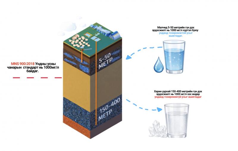 Ключевой аргумент строится на различии водоносных горизонтов. В тексте указано, что пастухи используют воду с глубины от пяти до 50 метров, при этом значительная часть колодцев в пустыне имеет глубину не больше десяти метров. Эта вода соответствует питьевым стандартам и имеет низкую минерализацию. А рудник Oyu Tolgoi берёт воду с глубины 150–400 метров, где она в три-четыре раза превышает допустимый уровень минерализации, абсолютно не пригодна для питья и не используется для бытовых нужд.