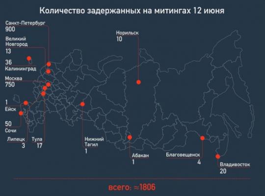 По все стране около 1800 задержанных. Из этого числа 866 - в Москве, более 548 - в Питере, и более 150 - в регионах.