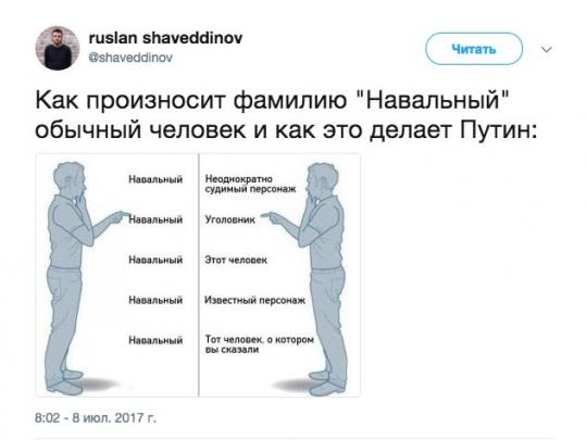Владимир Путин, как и его соратник Дмитрий Медведев, в публичных комментариях никогда не называет Алексея Навального по имени, что породило массу шуток в сети. Первые лица государства изворачиваются как могут и заменяют фамилию оппозиционера на «известный персонаж», «уголовник», «эти люди» и прочие смутные определения.