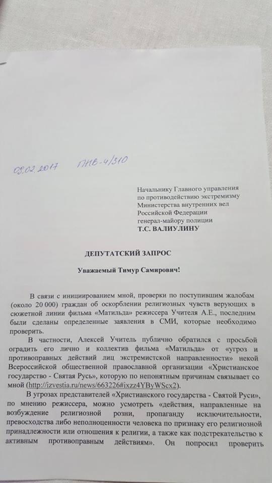 Константин Добрынин, который представляет интересы режиссера фильма «Матильда» Алексея Учителя, обратил внимание на то, что депутат Государственной думы Наталья Поклонская составляет депутатские запросы не на официальных бланках. Об этом юрист написал на своей странице в Facebook.