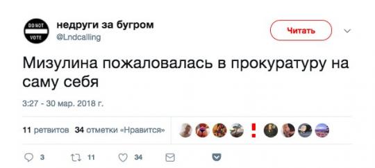 30 марта сенатор пожаловалась в Генпрокуратура на видео с ее же словами соболезнования Владимиру Путину. Мизулина обвинила СМИ, блогеров и пользователей социальных сетей в том, что они вырвали ее слова из контекста и распространяют только отрывок, в котором она соболезнует Путину, и игнорирую другие ее слова. Вот эти:
