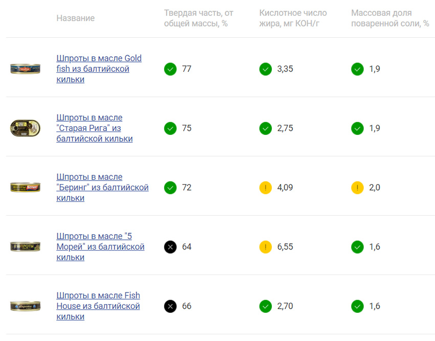 Однако полностью соответствуют ГОСТу лишь «Старая Рига» и Gold Fish, хотя никто из производителей не поленился написать слово «ГОСТ» на упаковке своей продукции. «Беринг» попался на сухой консистенции рыбы и низком качестве жира. Кроме того, в этих консервах самое высокое содержание соли и бензапирена. В баночку Fish House недовложили рыбы – твёрдая часть от общей массы составила 66% при ГОСТе 70%.