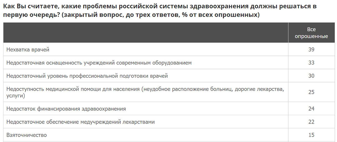 В числе главных проблем, которые необходимо решить государству, пациенты называют нехватку врачей (привет зарплате), недостаточный уровень их подготовки (привет системе образования), низкую оснащённость медучреждений современным оборудованием (привет финансированию и коррупции) и недоступность медицинской помощи и лекарств (привет оптимизации и госзакупкам).