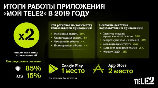 По итогам 2019 года число активных пользователей «Мой Tele2» выросло в два раза. Лидером по количеству клиентов сервиса стал столичный регион. В Московской области проживают около 30% пользователей приложения. В Санкт-Петербурге и Ленинградской области доля клиентов составляет 8%. Третье место по популярности приложения заняли Челябинская и Нижегородская области, где проживают по 4% пользователей сервиса.