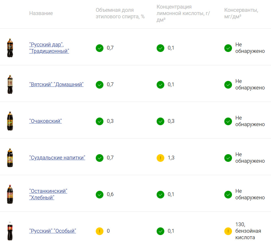 Эксперты Росконтроля проверили добросовестность производителей, протестировав состав и вкусовые качества кваса шести популярных в России торговых марок: «Суздальские напитки», «Вятский домашний», «Останкинский хлебный», «Русский особый», «Русский дар традиционный» и «Очаковский».