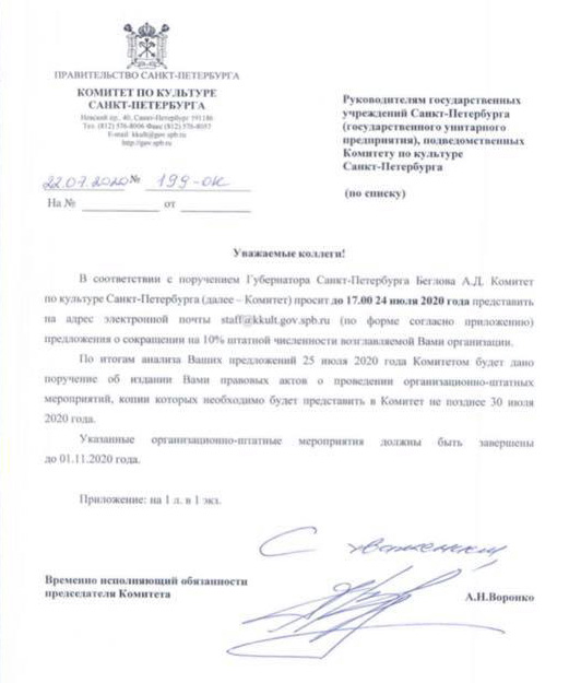 С оптимизацией чиновников решили, видимо, не спешить, а вот руководители учреждений культуры, находящиеся в подчинении комитета по культуре Санкт‑Петербурга, уже на следующий день получили «письмо счастья», в котором им было предложено в течение двух суток (до 17:00 24 июля) предоставить предложения по сокращению штатной численности организации на 10 %.