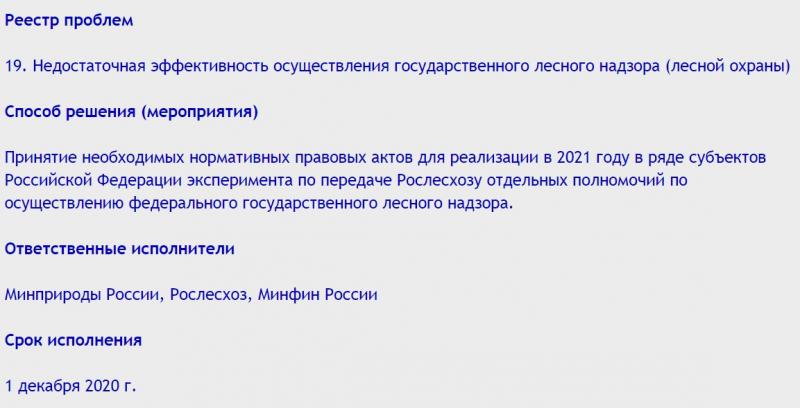 Дело в том, что Правительство РФ решило провести очередной эксперимент с лесным хозяйством страны. Согласно плану, который в октябре презентовала вице-премьер Правительства Виктория Абрамченко, среди мероприятий по декриминализации и развитию лесного комплекса есть пункт, предусматривающий передачу части полномочий по государственному лесному надзору на федеральный уровень.