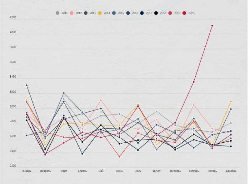 Для начала сделаем несколько обязательных оговорок. Официальные статистические ведомства России, вопреки логике и здравому смыслу, упорно скрывают реальную статистику по основным классам факторов смерти населения. Росстат, например, заявил, что в текущем году не будет публиковать эти данные, хотя выкладки за предыдущие годы лежат в открытом доступе. Сходные прецеденты можно наблюдать и на региональном уровне: в начале декабря ЗАГС Иркутской области сначала опубликовал, а затем удалил график помесячной смертности, на котором был хорошо виден чудовищный прирост в октябре-ноябре. Позже график вернули, но уже не в помесячном, а в годовом срезе.