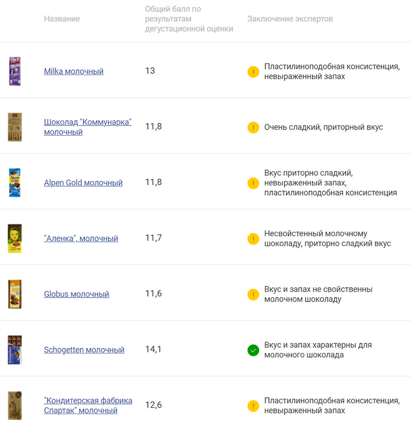 Шоколад Alpen Gold, Milka и «Спартак» разочаровал экспертов пластилиноподобной консистенцией и невыраженным запахом. Образцы «Алёнка» и Globus и вовсе попали в список товаров с замечаниями за приторно сладкий, не свойственный молочному шоколаду вкус.