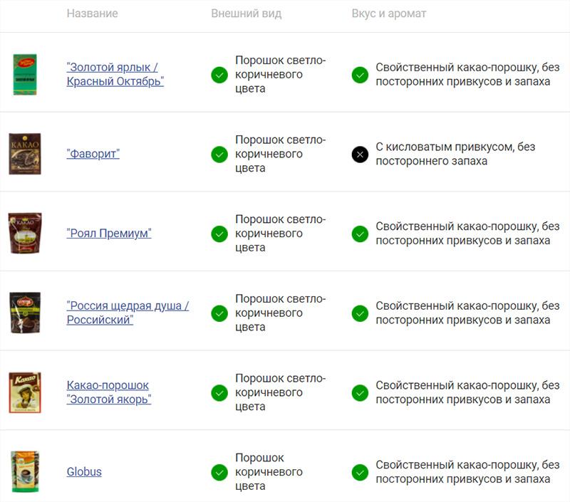 Специалисты Росконтроля провели исследование на качество и безопасность какао-порошка шести популярных в России торговых марок: «Золотой ярлык» от столичной фабрики «Красный Октябрь», «Фаворит» одноимённого ООО в Ленинградской области, «Роял премиум» производства ООО «Кофейная компания “Вокруг света”», «Россия щедрая душа – Российский» от ООО «Нестле Россия», «Золотой якорь» от Кондитерской фабрики «Богородская» и Globus, произведённый ООО «Инстанта Рус» специально для компании «Гиперглобус».