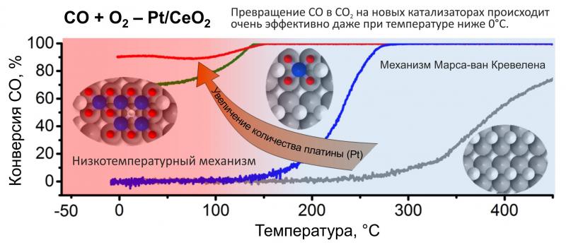 Они создали такой катализатор, который состоит из сложных наноструктурированных материалов на основе платина и церия. Первый представляет собой твёрдый металл, а второй тоже металл, который легко окисляется. Оказалось, что комбинация из этих элементов способна окислять угарный газ при температуре -50 градусов Цельсия.