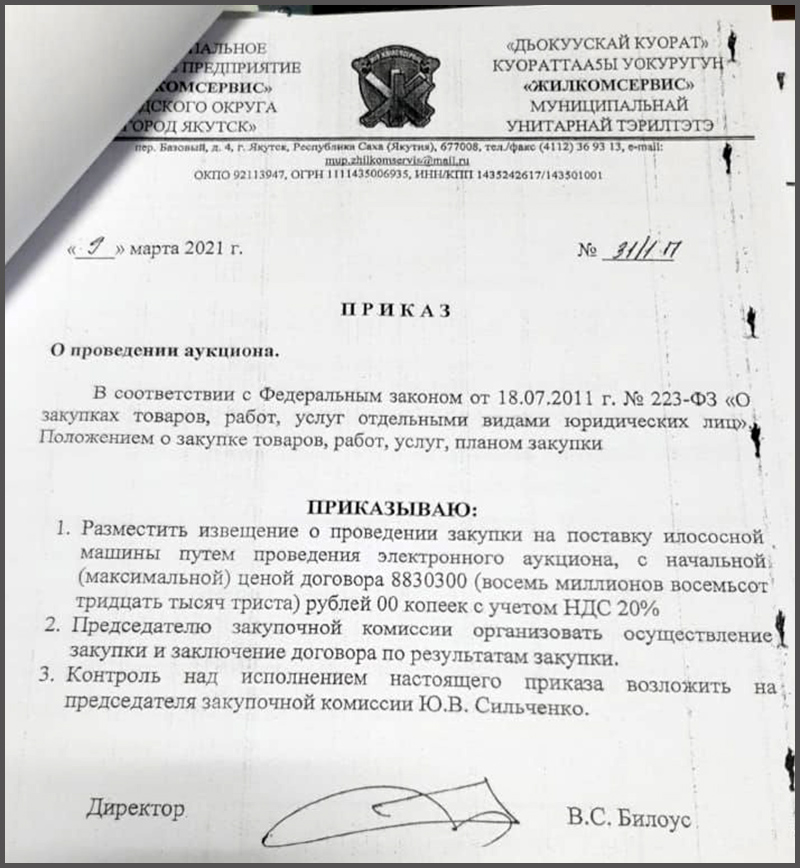 29 января 2021 года, когда кандидат на пост мэра Якутска Евгений Григорьев еще был исполняющим обязанности главы, за подписью директора МУП «Жилкомсервис» Валерии Билоус издан приказ №1577 о проведении закупки на поставку илососной машины путем проведения аукциона. К слову, илососная машина – это не просто техника, а целый комплекс оборудования для механизированной очистки канализации, колодцев, отстойников, от чего и удовольствие отнюдь не из дешевых.