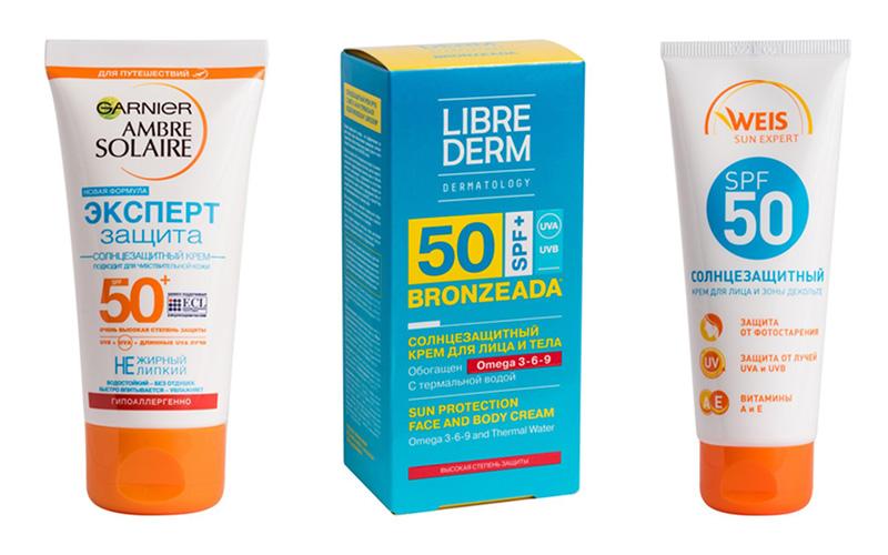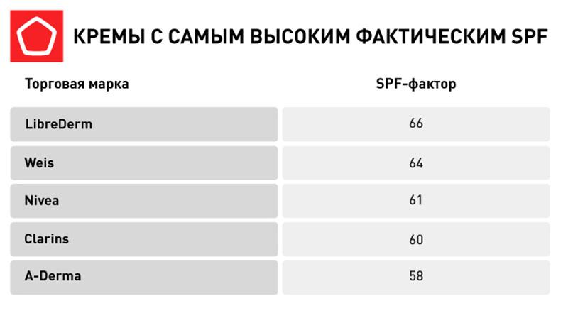 Согласно результатам лабораторных исследований Роскачества, до заявленного на упаковке показателя SPF 50 недотянули отечественные образцы Floresan (45,8) и Levrana (46,3). Самыми же эффективными кремами по показателю SPF стали образцы LibreDerm (Беларусь), Nivea (Германия), Clarins и A‑Derma из Франции и российский Weis.