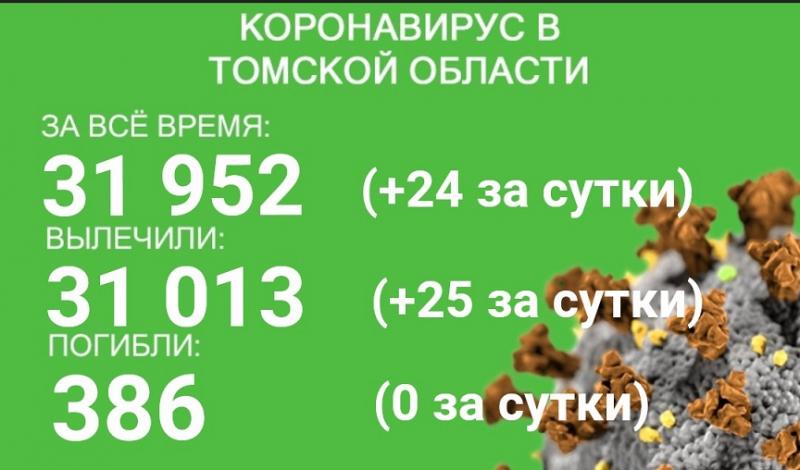 В Томской области 23 апреля официально подтверждено 24 случая коронавируса, за все время эпидемии заразились 31 952 человека.