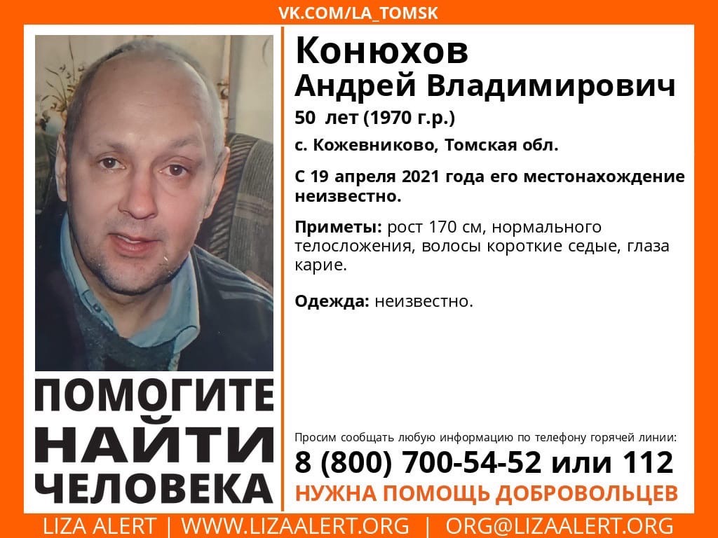 Местонахождение Андрея Владимировича Конюхова 1970 года рождения, проживающего в селе Кожевниково Томской области, неизвестно с 19 апреля 2021 года.
