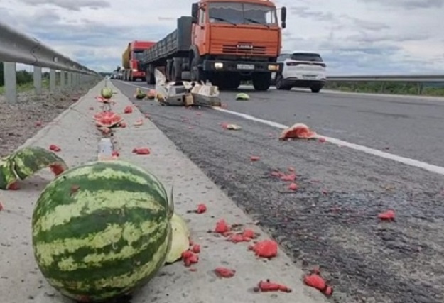 24 июня под Томском перевернулся седельный тягач с грузом – он вез арбузы.