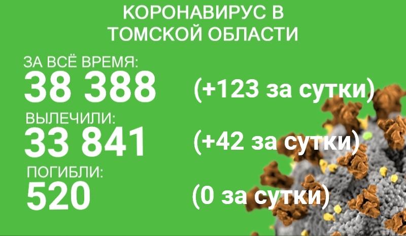 В Томской области коронавирус зарегистрирован у 38 388 человек. У 123 из них заболевание выявили в минувшие сутки.