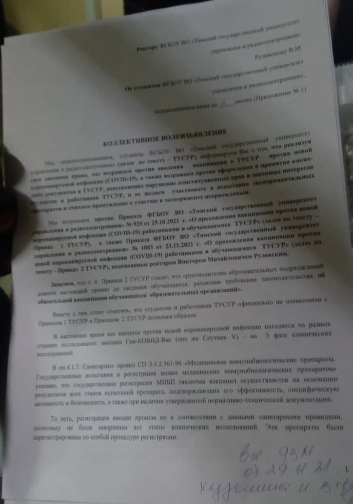 В пресс-службе ТУСУРа подтвердили, что инициативная группа передала в ректорат коллективное волеизъявление. С некоторым уточнением – направлено оно было против вакцинации в целом, а не QR-кодов. Всего документ подписали 15 студентов.