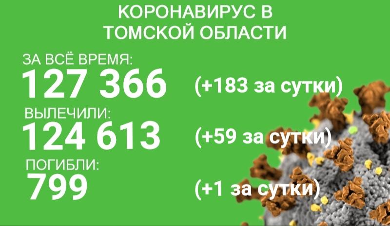 В Томской области за сутки с 6 по 7 апреля зафиксировано 183 случая коронавируса, госпитализированы 27 больных. Всего в регионе зарегистрировано 127 366 случаев новой коронавирусной инфекции.
